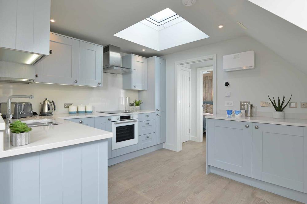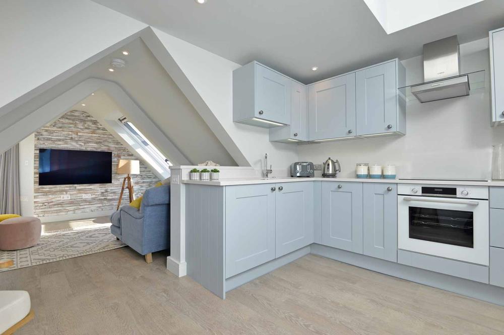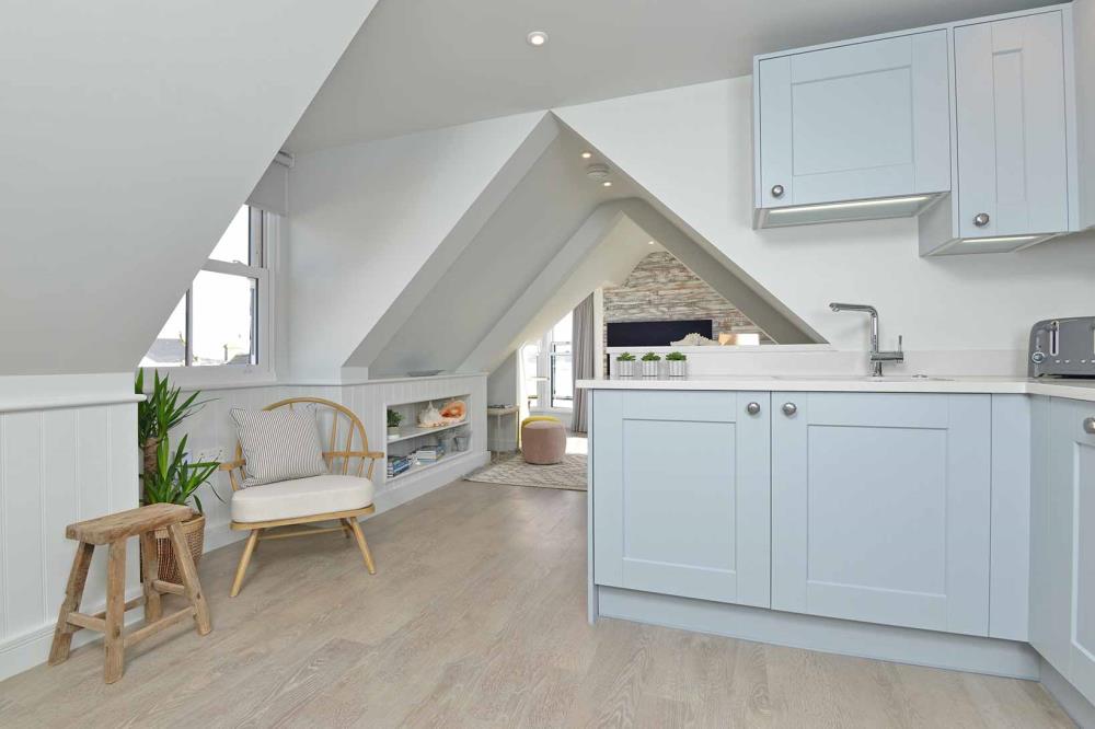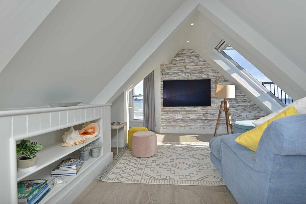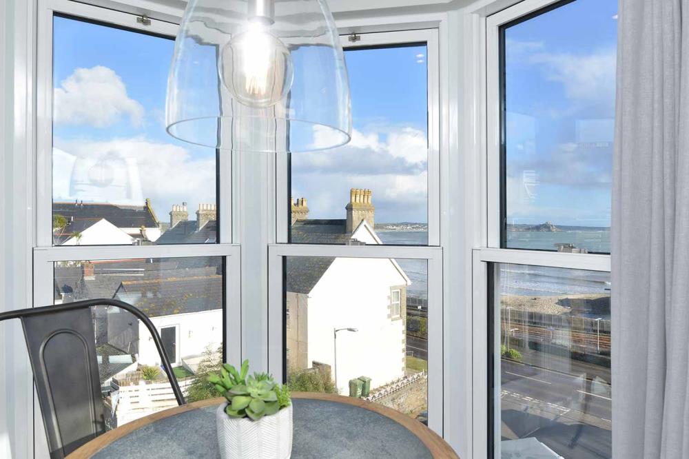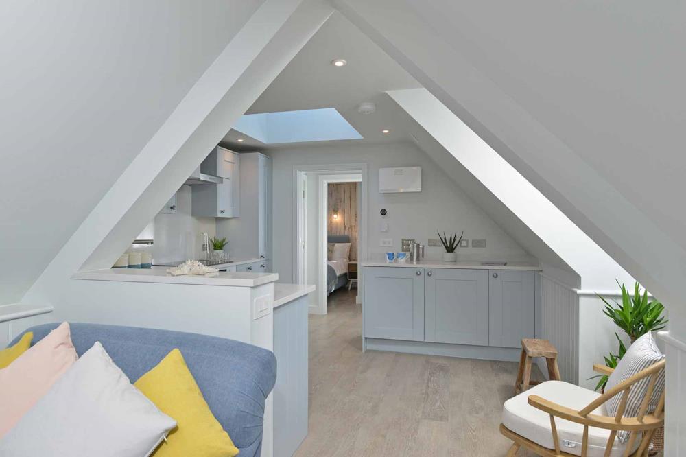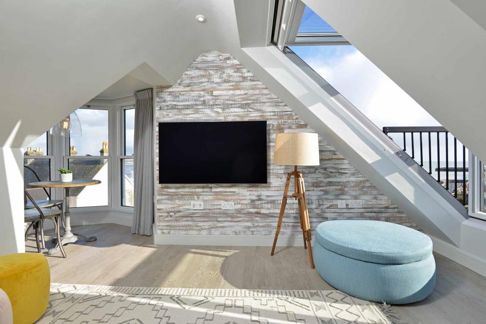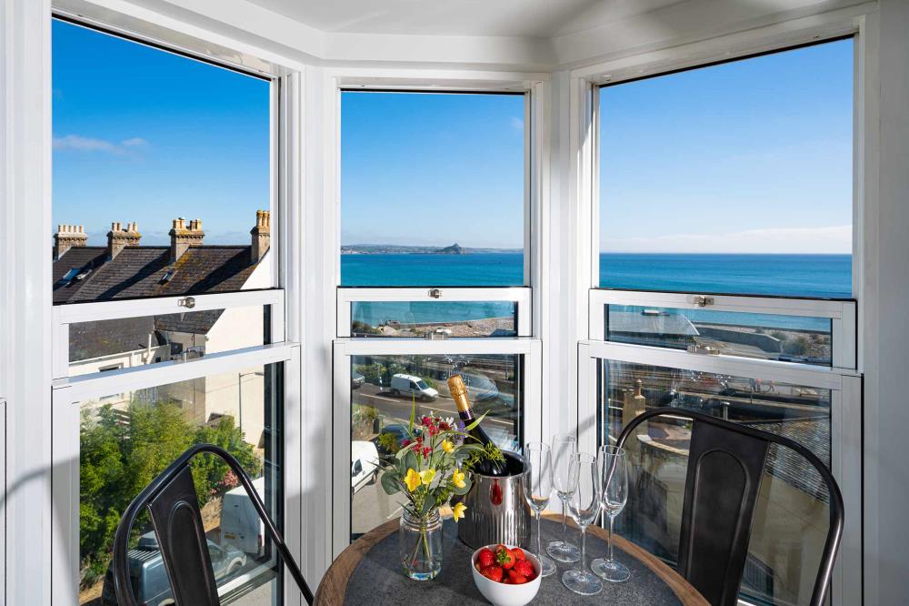The Lookout penthouse one bedroom apartment offers breath taking views from every window. With the added benefit of the Turret Window seating area and the Velux Cabrio Juliet balcony you have an amazing lockout from Newlyn to Marazion.